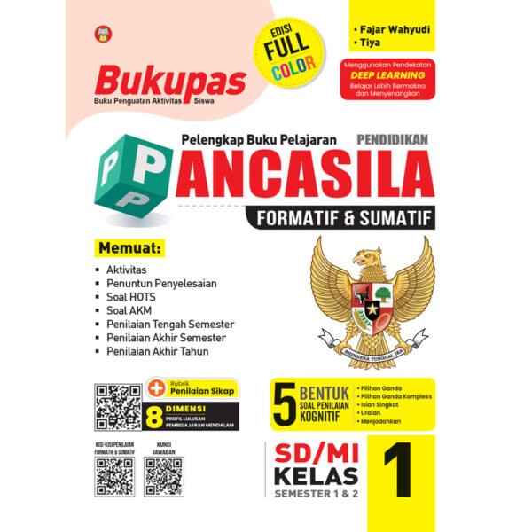 “Bukupas (Buku Penguatan Aktivitas Siswa) Pendidikan Pancasila untuk SD/MI Kelas 1” ini disusun berdasarkan Tujuan Pembelajaran yang akan dicapai siswa setelah mempelajari dan mengerjakan berbagai aktivitas dalam bentuk soal. Buku ini bertujuan sebagai pelengkap buku pelajaran pendidikan pancasila yang digunakan di sekolah dan sumber pengayaan bagi guru untuk kegiatan belajar di sekolah serta memandu orang tua/wali dalam pendampingan pembelajaran di rumah. Pada buku ini disajikan panduan Penilaian Formatif dan Sumatif. Penilaian Formatif merupakan penilaian yang dilakukan oleh guru pada saat proses pembelajaran sedang berlangsung. Sementara itu, Penilaian Sumatif merupakan penilaian yang dilakukan oleh guru pada periode tertentu dan hasil penilaiannya diakumulasi sebagai nilai rapor. Buku ini dilengkapi dengan ringkasan materi dan berbagai aktivitas dalam bentuk soal-soal yang bervariasi, seperti soal reguler, soal HOTS, dan soal AKM. Seluruh soal yang disajikan di dalam buku ini didasarkan pada materi yang telah dirancang sesuai dengan Tujuan Pembelajaran. Melalui berbagai variasi soal ini, diharapkan dapat menjadi acuan siswa untuk lebih siap dalam menghadapi berbagai ujian. Di samping itu, buku ini juga dilengkapi dengan remedial dan pengayaan. Tidak hanya itu, buku ini juga dilengkapi dengan kode QR yang berisi tentang kisi-kisi penilaian formatif dan sumatif serta kunci jawaban. Selamat belajar untuk menggapai cita-cita!