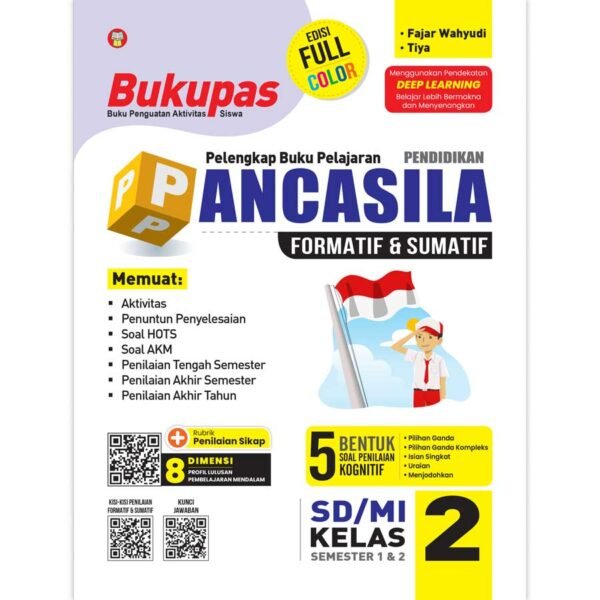 Bukupas (Buku Penguatan Aktivitas Siswa) Pendidikan Pancasila untuk SD/MI Kelas 2” ini disusun berdasarkan Tujuan Pembelajaran yang akan dicapai siswa setelah mempelajari dan mengerjakan berbagai aktivitas dalam bentuk soal. Buku ini bertujuan sebagai pelengkap buku pelajaran pendidikan pancasila yang digunakan di sekolah dan sumber pengayaan bagi guru untuk kegiatan belajar di sekolah serta memandu orang tua/wali dalam pendampingan pembelajaran di rumah. Pada buku ini disajikan panduan Penilaian Formatif dan Sumatif. Penilaian Formatif merupakan penilaian yang dilakukan oleh guru pada saat proses pembelajaran sedang berlangsung. Sementara itu, Penilaian Sumatif merupakan penilaian yang dilakukan oleh guru pada periode tertentu dan hasil penilaiannya diakumulasi sebagai nilai rapor. Buku ini dilengkapi dengan ringkasan materi dan berbagai aktivitas dalam bentuk soal-soal yang bervariasi, seperti soal reguler, soal HOTS, dan soal AKM. Seluruh soal yang disajikan di dalam buku ini didasarkan pada materi yang telah dirancang sesuai dengan Tujuan Pembelajaran. Melalui berbagai variasi soal ini, diharapkan dapat menjadi acuan siswa untuk lebih siap dalam menghadapi berbagai ujian. Di samping itu, buku ini juga dilengkapi dengan remedial dan pengayaan. Tidak hanya itu, buku ini juga dilengkapi dengan kode QR yang berisi tentang kisi-kisi penilaian formatif dan sumatif serta kunci jawaban. Selamat belajar untuk menggapai cita-cita!