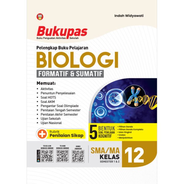 “Bukupas (Buku Penguatan Aktivitas Sekolah) Biologi untuk SMA/MA Kelas 12” ini disusun berdasarkan Tujuan Pembelajaran yang akan dicapai siswa setelah mempelajari dan mengerjakan berbagai aktivitas dalam bentuk soal. Buku ini bertujuan sebagai pelengkap buku pelajaran Biologi yang digunakan di sekolah dan sumber pengayaan bagi guru untuk kegiatan belajar di sekolah serta melatih siswa dalam pembelajaran di rumah secara mandiri. Pada buku ini disajikan Penilaian Formatif dan Sumatif. Penilaian Formatif merupakan penilaian yang dilakukan oleh guru pada saat proses pembelajaran sedang berlangsung. Sementara itu, Penilaian Sumatif merupakan penilaian yang dilakukan oleh guru pada periode tertentu dan hasil penilaiannya diakumulasi sebagai nilai rapor. Buku Bukupas Biologi untuk SMA/MA Kelas 12 ini dilengkapi dengan ringkasan materi dan berbagai aktivitas dalam bentuk soal-soal yang bervariasi, seperti soal reguler, soal HOTS, soal AKM, soal Olimpiade, dan soal Ujian Sekolah. Seluruh soal yang disajikan di dalam buku ini didasarkan pada materi yang telah dirancang sesuai dengan Tujuan Pembelajaran. Melalui berbagai variasi soal ini, diharapkan dapat menjadi acuan siswa untuk lebih siap dalam menghadapi berbagai ujian. Di samping itu, buku Bukupas Biologi untuk SMA/MA Kelas 12 ini juga dilengkapi dengan remedial, pengayaan, dan penguatan Profil Pelajar Pancasila. Rubrik penguatan Profil Pelajar Pancasila bertujuan untuk memperkuat pembentukan karakter siswa dalam memahami keberagaman bangsa dan keberagaman global. Tidak hanya itu, buku ini juga dilengkapi dengan kode QR yang berisi tentang kumpulan soal latihan Ujian Sekolah dan Ujian Nasional serta AKM lengkap dengan pembahasannya dalam bentuk aplikasi yang bisa diunduh melalui Google Play, serta kunci jawaban. Selamat belajar untuk menggapai cita-cita!