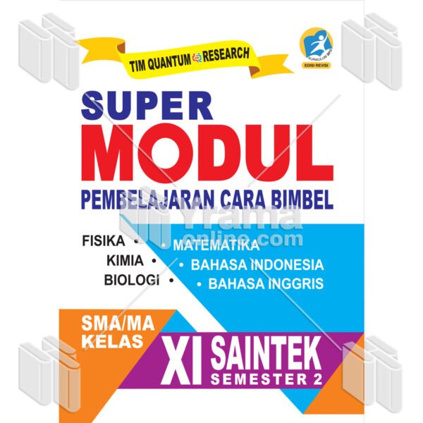 Buku Super Modul Pembelajaran Cara Bimbel SMA/MA Kelas XI Saintek Semester 2 ini terdiri atas tujuh mata pelajaran. Yaitu Fisika, Kimia, Biologi, Matematika, Bahasa Indonesia, dan Bahasa Inggris. Setiap mata pelajaran terdiri atas 18 pertemuan (untuk mata pelajaran Fisika, Kimia, Biologi, Matematika, Bahasa Indonesia, dan Bahasa Inggris) dan 8 pertemuan (untuk mata pelajaran Bahasa Indonesia dan Bahasa Inggris), sesuai dengan kegiatan pembelajaran di sekolah. Dengan demikian, keluasan dan kedalaman materi pada setiap pertemuannya dapat memenuhi kompetensi dasar yang diharapkan dalam setiap mata pelajarannya.