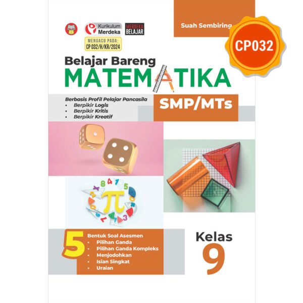 Di era pembelajaran abad 21, Matematika merupakan ilmu yang sangat dibutuhkan manusia untuk hidup di tengah teknologi berkembang kian pesat. Indonesia yang juga mengambil peran dalam kemajuan teknologi dunia, mempersiapkan generasi penerus bangsa dengan menyisipkan muatan Profil Pelajar Pancasila. Sejalan dengan kebijakan ini, pelajaran Matematika pun dikembangkan dengan tujuan untuk mengembangkan kemandirian, kemampuan bernalar kritis, dan kreativitas siswa. Buku “Belajar Bareng Matematika untuk SMP/MTs Kelas 9” ini disusun berdasarkan capaian pembelajaran pada Kurikulum Merdeka yang tertuang pada keputusan Kepala Badan Standar, Kurikulum, dan Asesmen Pendidikan Kemendikbudristek Nomor 032/H/KR/2024 tentang Capaian Pembelajaran pada Pendidikan Anak Usia Dini, Jenjang Pendidikan Dasar, dan Jenjang Pendidikan Menengah pada Kurikulum Merdeka. Buku ini hadir untuk memperluas dan memperdalam materi inti yang tersaji dalam Buku Teks Utama yang ditetapkan oleh pemerintah, khususnya Kemendikbudristek. Buku ini juga disusun khusus untuk membantu siswa menanamkan keterampilan abad 21 sebagai bekal di kehidupannya. Konsep Matematika dalam buku Belajar Bareng Matematika untuk SMP/MTs Kelas 9 ini disampaikan dalam bentuk aktivitas yang mendukung kemandirian, kerja sama, bernalar kritis, serta kreativitas siswa. Soal latihan yang ada di buku ini juga memberikan kesempatan siswa untuk berlatih beragam bentuk soal asesmen yang meliputi isian singkat, menjodohkan, pilihan ganda, pilihan ganda kompleks, dan uraian. Oleh sebab itu, buku ini juga cocok digunakan untuk siswa belajar mandiri dalam mempersiapkan berbagai jenis ujian, mulai dari PH, PTS, PAS, AKM, PAT, bahkan hingga OSN.