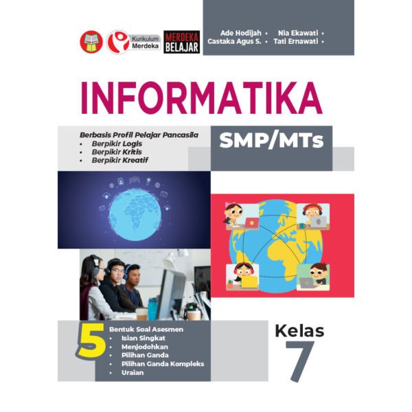 Buku Informatika untuk SMP/MTs Kelas 7 Di era sekarang ini, kebutuhan akan ilmu teknologi sangatlah penting, di mana semua aspek dalam kehidupan manusia sudah banyak menggunakan teknologi. Agar melek terhadap teknologi maka diperlukan mempelajari Informatika. Informatika adalah bidang ilmu mengenai studi, perancangan, dan pembuatan sistem komputasi, serta prinsip-prinsip yang menjadi dasar perancangan tersebut. Pembelajaran Informatika di jenjang SMP/MTs Kelas 7 ini disusun berdasarkan Capaian Pembelajaran (CP) yang terdiri atas: Berpikir Komputasional, Teknologi Informasi dan Teknologi, Sistem Komputer, Jaringan Komputer dan Internet, Analisis Data, Algoritma dan Pemrograman, Dampak Sosial Informatika, dan Praktik Lintas Bidang. Dengan adanya mata pelajaran Informatika ini, diharapkan dapat melahirkan generasi melek teknologi di masa yang akan datang dengan kemampuan bernalar kritis dan kreatif sesuai profil pelajar Pancasila. Buku Informatika untuk SMP/MTs Kelas 7 ini dilengkapi dengan aktivitas siswa yang dilakukan secara mandiri maupun kelompok. Aktivitas siswa yang disajikan dalam buku, juga mendukung kegiatan praktik. Untuk mengevaluasi siswa, di akhir setiap bab diberikan soal-soal untuk mengukur ketercapaian siswa.