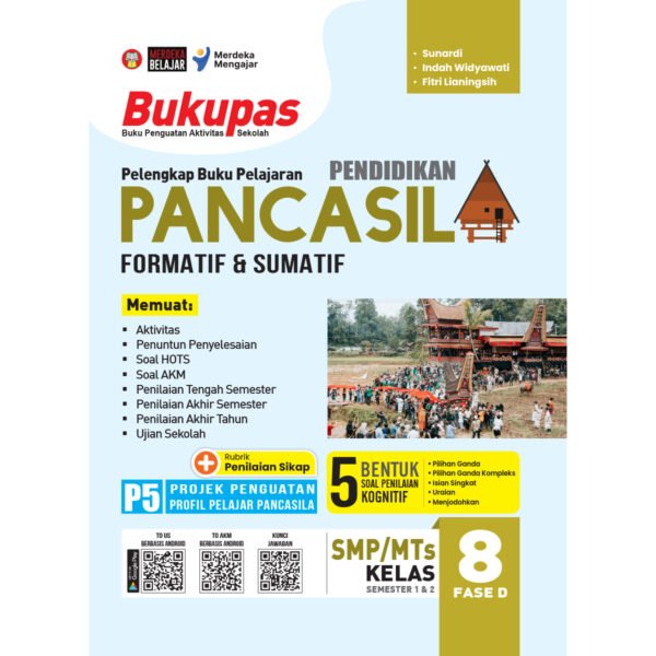 “Bukupas (Buku Penguatan Aktivitas Sekolah) Pendidikan Pancasila untuk SMP/MTs Kelas 8 Fase D” ini disusun berdasarkan Capaian Pembelajaran. Buku ini bertujuan sebagai pelengkap buku pelajaran pendidikan Pancasila yang digunakan di sekolah dan sumber pengayaan bagi guru untuk kegiatan belajar di sekolah serta melatih siswa dalam pembelajaran di rumah secara mandiri. Pada Bukupas Pendidikan Pancasila untuk SMP/MTs Kelas 8 Fase D ini disajikan panduan Penilaian Formatif dan Sumatif. Penilaian Formatif merupakan penilaian yang dilakukan oleh guru pada saat proses pembelajaran sedang berlangsung. Sementara itu, Penilaian Sumatif merupakan penilaian yang dilakukan oleh guru pada periode tertentu dan hasil penilaiannya diakumulasi sebagai nilai rapor. Bukupas Pendidikan Pancasila untuk SMP/MTs Kelas 8 Fase D ini dilengkapi dengan ringkasan materi dan berbagai aktivitas dalam bentuk soal-soal yang bervariasi, seperti soal reguler, soal HOTS, soal AKM, dan soal Ujian Sekolah. Seluruh soal yang disajikan di dalam buku ini didasarkan pada materi yang telah dirancang sesuai dengan Tujuan Pembelajaran. Melalui berbagai variasi soal ini, diharapkan dapat menjadi acuan siswa untuk lebih siap dalam menghadapi berbagai ujian. Di samping itu, buku ini juga dilengkapi dengan remedial, pengayaan, dan penguatan Profil Pelajar Pancasila. Rubrik penguatan Profil Pelajar Pancasila bertujuan untuk memperkuat pembentukan karakter siswa dalam memahami keberagaman bangsa dan keberagaman global. Tidak hanya itu, buku ini juga dilengkapi dengan kode QR yang berisi tentang kumpulan soal latihan Ujian Sekolah dan AKM lengkap dengan pembahasannya dalam bentuk aplikasi yang bisa diunduh melalui Google Play, serta kunci jawaban. Selamat belajar untuk menggapai cita-cita!