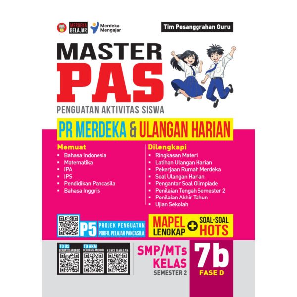 BUKU MASTER PAS UNTUK SMP/MTs KELAS 7B FASE DBuku “MASTER PAS (Penguatan Aktivitas Siswa) PR MERDEKA & ULANGAN HARIAN untuk SMP/MTs Kelas 7b Fase D Semester 2” ini dirancang khusus untuk membantu siswa mempersiapkan diri lebih dini menghadapi ulangan harian dengan berlatih mengerjakan soal. Sesuai dengan judul bukunya, di dalam buku ini memuat dua rubrik soal, yaitu Latihan Ulangan Harian dan Pekerjaan Rumah. Soal Latihan Ulangan Harian merupakan kumpulan soal yang dikerjakan di sekolah dengan bimbingan guru, sedangkan soal Pekerjaan Rumah (PR) merupakan kumpulan soal yang dikerjakan di rumah dengan bimbingan orang tua/wali. Tidak hanya sekadar menyajikan kumpulan soal, buku ini juga memberikan panduan yang komprehensif sehingga terbentuk pemahaman konsep yang benar terhadap materi pelajaran. Buku Master PAS PR Merdeka & Ulangan Harian untuk SMP/MTs Kelas 7b Fase D Semester 1 ini memuat mata pelajaran lengkap, meliputi Bahasa Indonesia, Matematika, IPA, IPS, Pendidikan Pancasila, dan Bahasa Inggris. Setiap mata pelajaran tersusun atas Ringkasan Materi, Latihan Ulangan Harian, dan Pekerjaan Rumah. Buku ini dilengkapi juga dengan kumpulan soal Penilaian Tengah Semester 2, Penilaian Akhir Tahun, Ujian Sekolah, dan Projek Penguatan Profil Pelajar Pancasila (P5). Konten P5 yang disajikan di dalam buku ini bertujuan untuk memberikan gambaran terkait tema dan topik yang dipilih sebagai projek, mulai dari tahap Perencanaan, Pelaksanaan, sampai Evaluasi terhadap projek tersebut. Dengan menggunakan buku Master PAS PR Merdeka & Ulangan Harian untuk SMP/MTs Kelas 7b Fase D Semester 1 tidak hanya siswa yang dapat memaksimalkan potensi belajar mereka untuk meningkatkan nilai akademik dan membangun kemandirian, akan tetapi guru dan orang tua/wali siswa pun dapat menggunakan buku ini untuk menuntun, membimbing, dan membersamai anak dalam proses pembelajaran di sekolah maupun di rumah.
