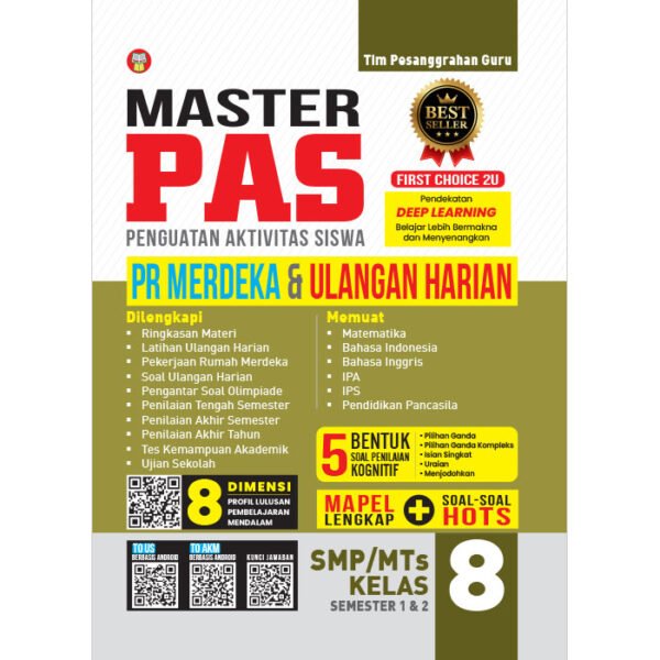 Buku “MASTER PAS (Penguatan Aktivitas Siswa) PR MERDEKA & ULANGAN HARIAN untuk SMP/MTs Kelas 8 Fase D Semester 1 & 2” ini dirancang khusus untuk membantu siswa mempersiapkan diri lebih dini menghadapi ulangan harian dengan berlatih mengerjakan soal. Sesuai dengan judul bukunya, di dalam buku ini memuat dua rubrik soal, yaitu Latihan Ulangan Harian dan Pekerjaan Rumah. Soal Latihan Ulangan Harian merupakan kumpulan soal yang dikerjakan di sekolah dengan bimbingan guru, sedangkan soal Pekerjaan Rumah (PR) merupakan kumpulan soal yang dikerjakan di rumah dengan bimbingan orang tua/wali. Tidak hanya sekadar menyajikan kumpulan soal, buku ini juga memberikan panduan yang komprehensif sehingga terbentuk pemahaman konsep yang benar terhadap materi pelajaran. Buku ini memuat mata pelajaran lengkap, meliputi Matematika, Bahasa Indonesia, Bahasa Inggris, IPA, IPS, dan Pendidikan Pancasila. Setiap mata pelajaran tersusun atas Ringkasan Materi, Latihan Ulangan Harian, dan Pekerjaan Rumah. Buku ini dilengkapi juga dengan kumpulan soal Penilaian Tengah Semester 1 dan 2, Penilaian Akhir Semester, Penilaian Akhir Tahun, Ujian Sekolah, dan Projek Penguatan Profil Pelajar Pancasila (P5). Konten P5 yang disajikan di dalam buku ini bertujuan untuk memberikan gambaran terkait tema dan topik yang dipilih sebagai projek, mulai dari tahap Perencanaan, Pelaksanaan, sampai Evaluasi terhadap projek tersebut. Dengan menggunakan buku ini, tidak hanya siswa yang dapat memaksimalkan potensi belajar mereka untuk meningkatkan nilai akademik dan membangun kemandirian. Akan tetapi, guru dan orang tua/wali siswa pun dapat menggunakan buku ini untuk menuntun, membimbing, dan membersamai anak dalam proses pembelajaran di sekolah maupun di rumah.