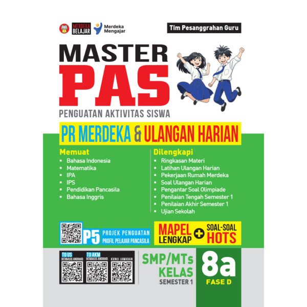 Buku “MASTER PAS (Penguatan Aktivitas Siswa) PR MERDEKA & ULANGAN HARIAN untuk SMP/MTs Kelas 8a Fase D Semester 1” ini dirancang khusus untuk membantu siswa mempersiapkan diri lebih dini menghadapi ulangan harian dengan berlatih mengerjakan soal. Sesuai dengan judul bukunya, di dalam buku ini memuat dua rubrik soal, yaitu Latihan Ulangan Harian dan Pekerjaan Rumah Merdeka. Soal Latihan Ulangan Harian merupakan kumpulan soal yang dikerjakan di sekolah dengan bimbingan guru, sedangkan soal Pekerjaan Rumah Merdeka (PR) merupakan kumpulan soal yang dikerjakan di rumah dengan bimbingan orang tua/wali. Tidak hanya sekadar menyajikan kumpulan soal, buku ini juga memberikan panduan yang komprehensif sehingga terbentuk pemahaman konsep yang benar terhadap materi pelajaran. Buku Master PAS PR Merdeka & Ulangan Harian untuk SMP/MTs Kelas 8a Fase D Semester 1 ini memuat mata pelajaran lengkap, meliputi Bahasa Indonesia, Matematika, IPA, IPS, Pendidikan Pancasila, dan Bahasa Inggris. Setiap mata pelajaran tersusun atas Ringkasan Materi, Latihan Ulangan Harian, dan Pekerjaan Rumah Merdeka. Buku ini dilengkapi juga dengan kumpulan soal Penilaian Tengah Semester 1, Penilaian Akhir Semester 1, Ujian Sekolah, dan Projek Penguatan Profil Pelajar Pancasila (P5). Konten P5 yang disajikan di dalam buku ini bertujuan untuk memberikan gambaran terkait tema dan topik yang dipilih sebagai projek, mulai dari tahap Perencanaan, Pelaksanaan, sampai Evaluasi terhadap projek tersebut. Dengan menggunakan Master PAS PR Merdeka & Ulangan Harian untuk SMP/MTs Kelas 8a Fase D Semester 1 ini, tidak hanya siswa yang dapat memaksimalkan potensi belajar mereka untuk meningkatkan nilai akademik dan membangun kemandirian, akan tetapi guru dan orang tua/wali siswa pun dapat menggunakan buku ini untuk menuntun, membimbing, dan membersamai anak dalam proses pembelajaran di sekolah maupun di rumah.