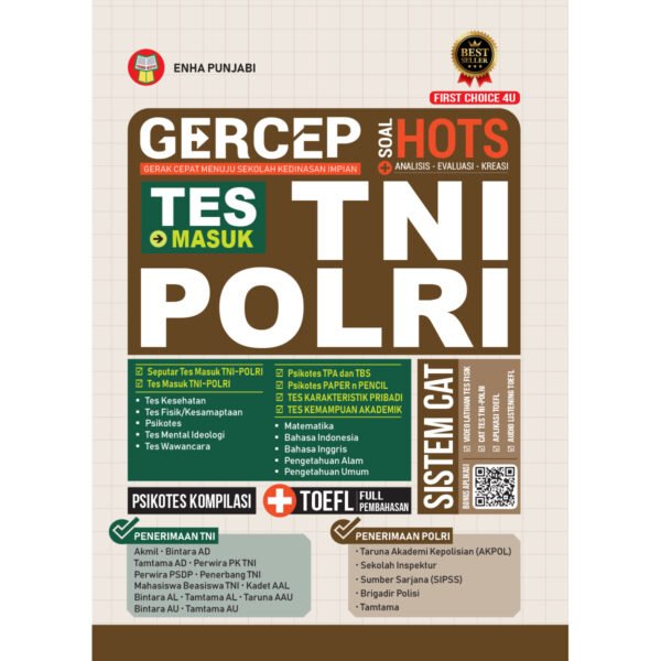 Buku GERCEP Tes Masuk TNI POLRI merupakan buku pegangan bagi calon peserta ujian TNI-POLRI. Buku ini dapat Anda gunakan sebagai acuan belajar. Jumlah soal sangat fantastis, tidak pernah ada di buku lain yang khusus membahas Tes Masuk TNI–POLRI. Buku GERCEP Tes Masuk TNI POLRI ini juga dapat Anda gunakan sebagai latihan sehingga menjadi senjata ampuh untuk menembus impian menjadi anggota TNI–POLRI. Informasi Seputer Tes TNI-POLRI Bagian ini berisi informasi pendaftaran dan materi tes masuk anggota TNI-POLRI yang dikupas secara detail. Hal ini sebagai awal agar Anda mengetahui apa yang harus dilakukan. Materi Ujian Bagian ini berisi tips dan trik untuk menjalani berbagai jenis tes. Psikotes (TPA+TBS) Bagian ini berisi paket soal psikotes yang mencakup kemampuan verbal, kemampuan numerik, kemampuan analitik, dan kemampuan spasial. Bagian ini juga dilengkapi dengan kunci dan pembahasan. Psikotes Paper and Pencil Bagian ini berisi informasi seputar Paper and Pencil yang meliputi Tes BAUM/Draw a Tee, Draw a Man, House Tree Person Test, Tes Wartegg, dan Tes Kraepelin-Pauili. Tes Karakteristik Pribadi Bagian ini berisi seputar Tes Kepribadian yang bertujuan mendeteksi tingkat kematangan seseorang. Tes Kemampuan Akademik Bagian ini berisi beberapa paket soal psikotes. Plus TOEFL Full Pembahasan Bagian ini berisi paket soal dan Pembahasan TOEFL. Free Bonus Aplikasi Bonus buku ini adalah CAT TNI-POLRI, Psikotes, Tes Buta Warna, Tes TOEFL, serta Video Latihan Tes Fisik.